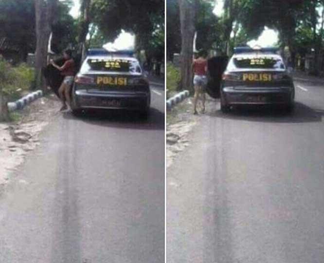 Sebuah foto mobil polisi yang tertangkap kamera saat sedang menurunkan seorang gadis berbusana hot pants mengejutkan para pengguna media sosial.